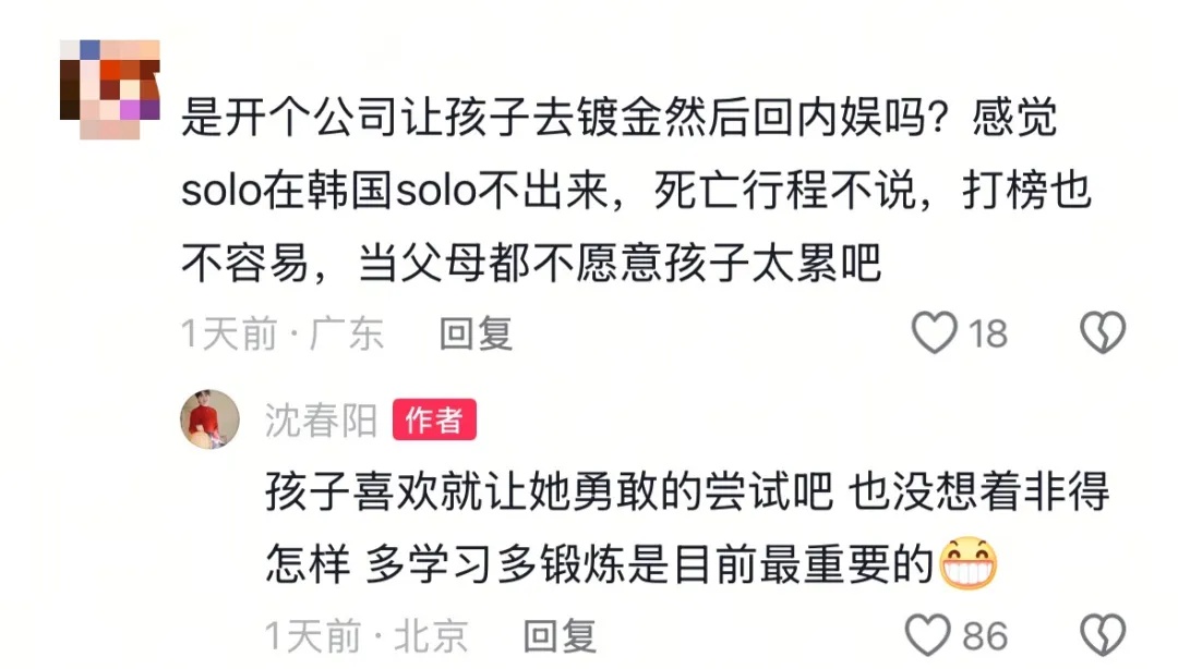 在沈佳润的妈妈沈春阳的账号评论区,有网友留言:“是开个公司让孩子去镀金然后回内娱吗?感觉solo在韩国solo不出来,死亡行程不说,打榜也不容易,当父母都不愿意孩子太累吧。”